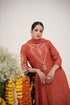 Kesariya keri anarkali set with dupatta and pants. Placket yolk with zardosi work on front, lined work on bottom and chitta dupatta.