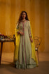 Sea green zardosi work long jacket paired with ghaghra paired with yellow dupatta.