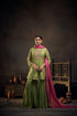 Green flowy placket embriodered kurta, sharara with tikki Gand detailed dupatta with hand embroidered line. Mango Yellow flowy placket embriodered kurta, sharara with tikki Gand detailed dupatta with hand embroidered line.